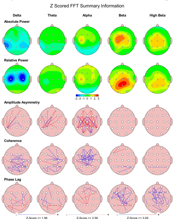 Compares hundreds of measures from the client against a database of people recorded to produce dozens of “z-scores”—specific measures in specific areas of the client’s brain which differ from “average”.