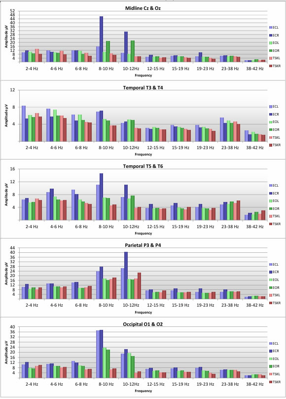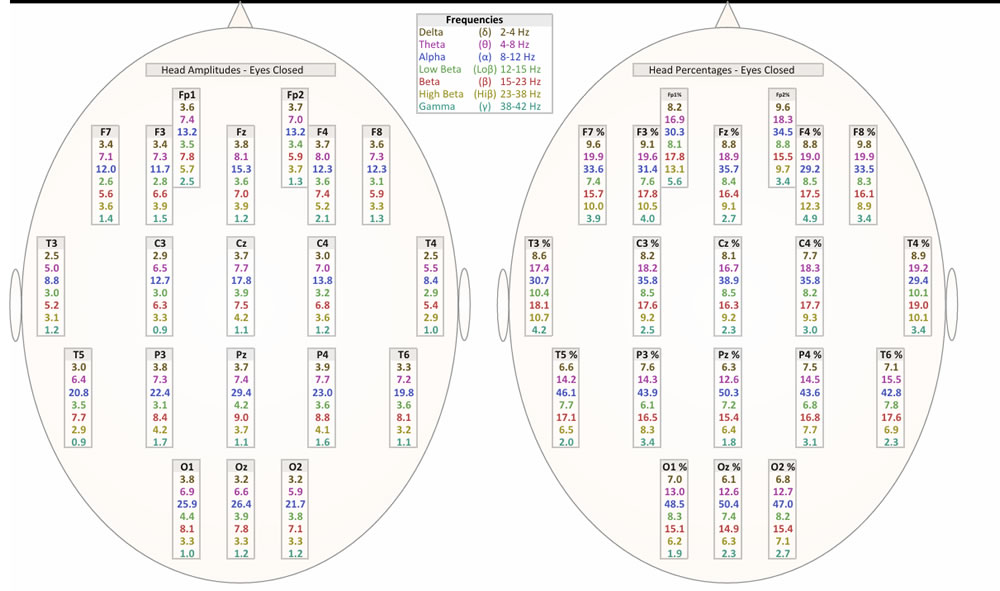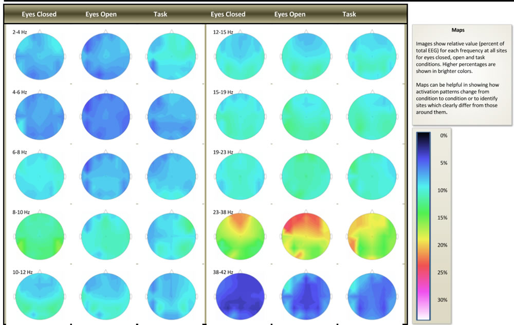 QEEG’s record data from 20 or more standard EEG sites on the head. This is done during eyes-closed, eyes-open and task conditions. The result is a picture of how brain activation changes from resting to awareness to active processing states. The Q removes “artifacts” (electrical signals in the EEG which do not come from the brain) and presents the data in terms of the main measures of brain activity: frequency, amplitude, stability and connectivity.